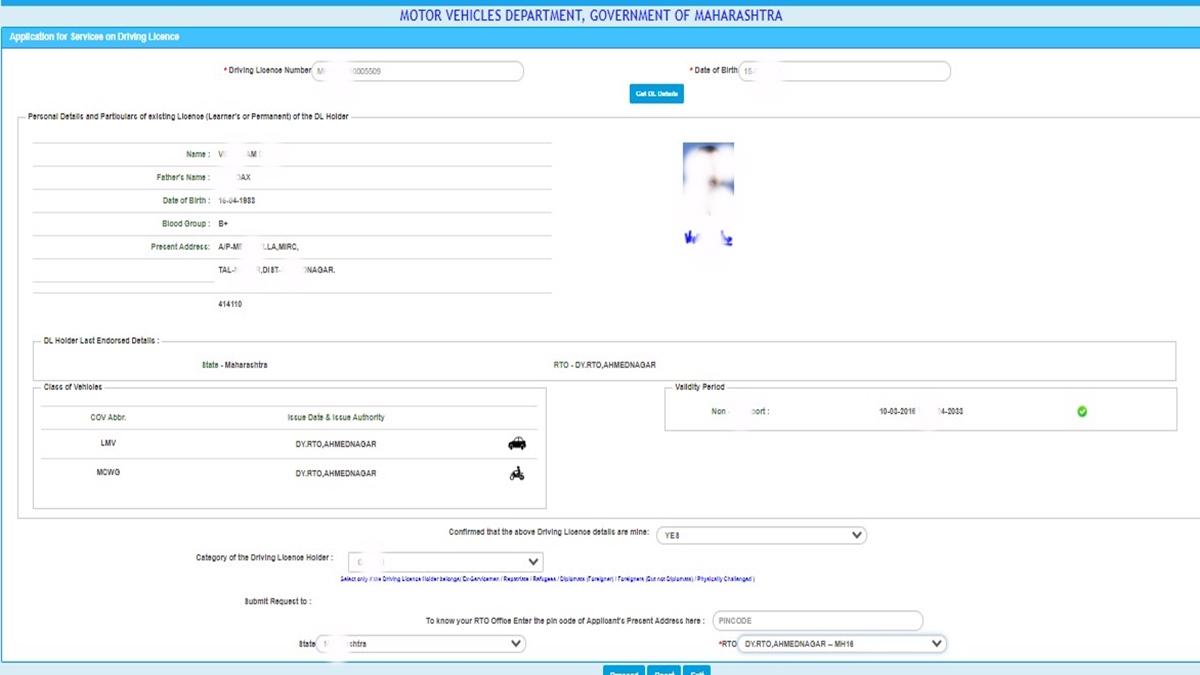 Step 5: Check the details as per your driving license and confirm that they are correct. Select your state and RTO. Click Proceed.
