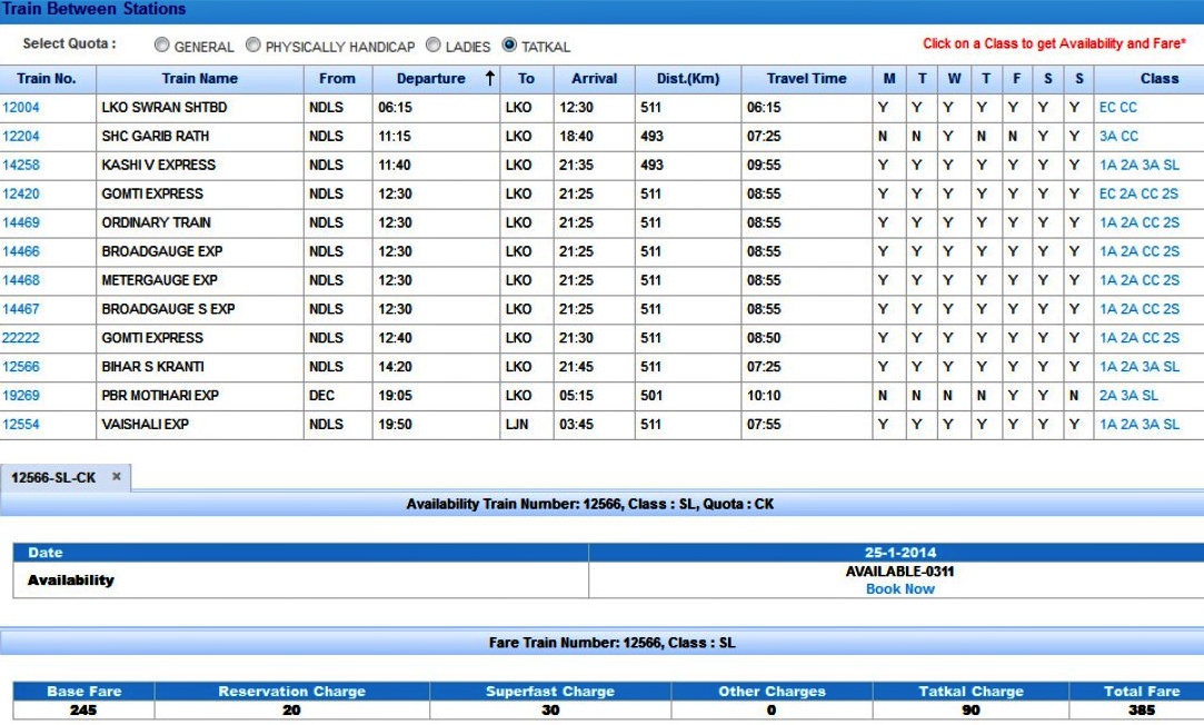 Step 3: Choose the train you want to travel by and click on the class abbreviations to get availability. Click on the Book Now link for the selected train and class.