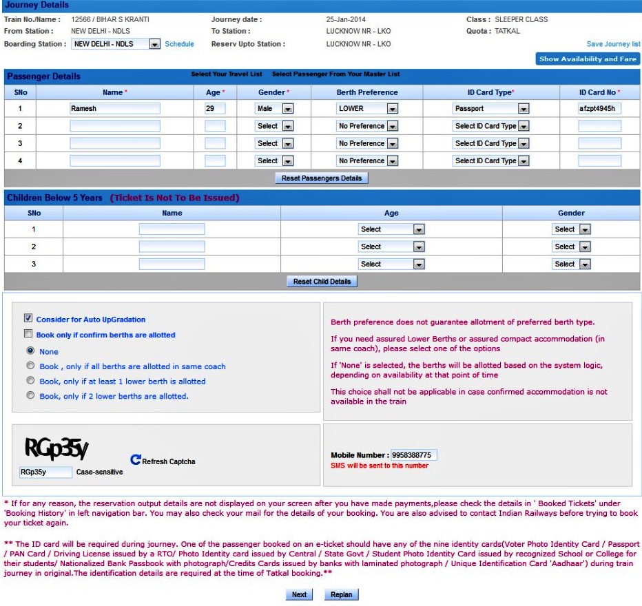 Step 4: Enter details of up to 4 passengers. Passenger names can have up to 15 characters. Enter the mobile number for SMS notifications and the captcha code. Click on the Next button.
