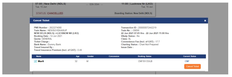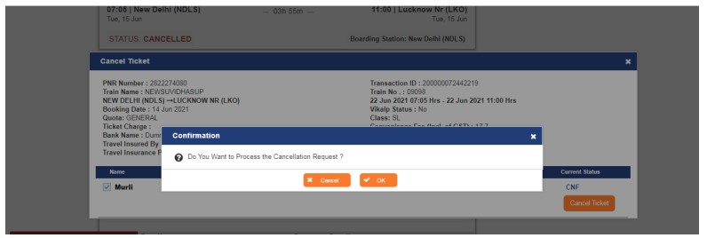 Step 4: Select the passenger names who’s tickets are to be cancelled. Click on the Cancel Ticket button