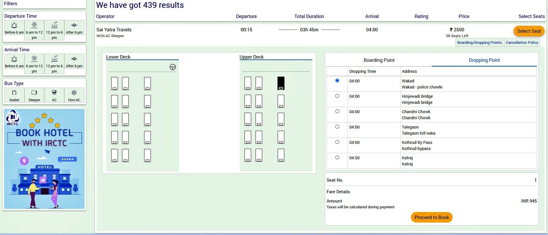 Step 4: Select the bus you want to travel on and click on the Select seat button. Choose a seat, boarding point and dropping point. Click on the Proceed to Book button.
